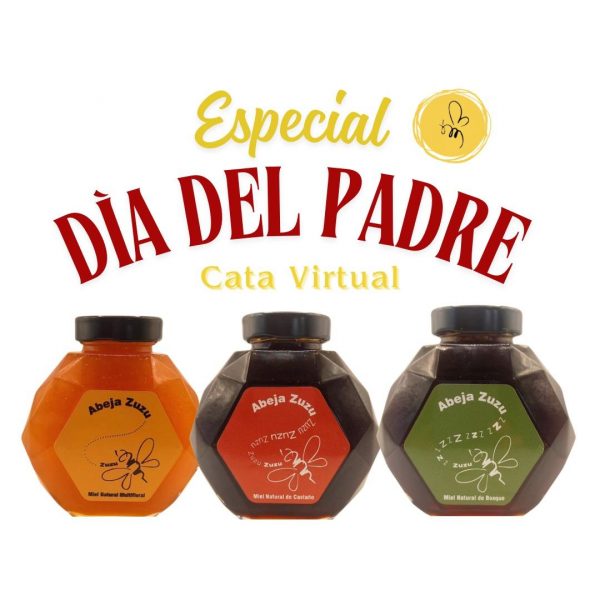 Tu padre recibirá en casa un exclusivo pack con las tres diamantes de miel pura y artesanal de la Abeja Zuzu,🌲bosque, 🌰castaño y 💐mil flores, explorará el apasionante mundo de la apicultura y podrá degustar la miel a través de la cata virtual divertida y enriquecedora acompañado de la familia, con amigos o con quien desee, guiada por Diana Isabel Esteban sumiller y fundadora de Abeja Zuzu.